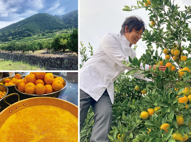 南濃町は岐阜県唯一のみかん産地。ここは、グランシェフパティシエ・鈴木滋夫が生まれ育った故郷です。みかん産地としては日本の北限とされる土地柄か、果実に甘味だけではなく香りや酸味があるのが特徴です。今回のショコラでは摘果された青みかんや完熟みかんを自家製のジャムやパート・ド・フリュイにして使用。「失われつつある里山の景色や故郷のみかん農業を守ることに少しでも繋がってほしい」という願いを込めました。