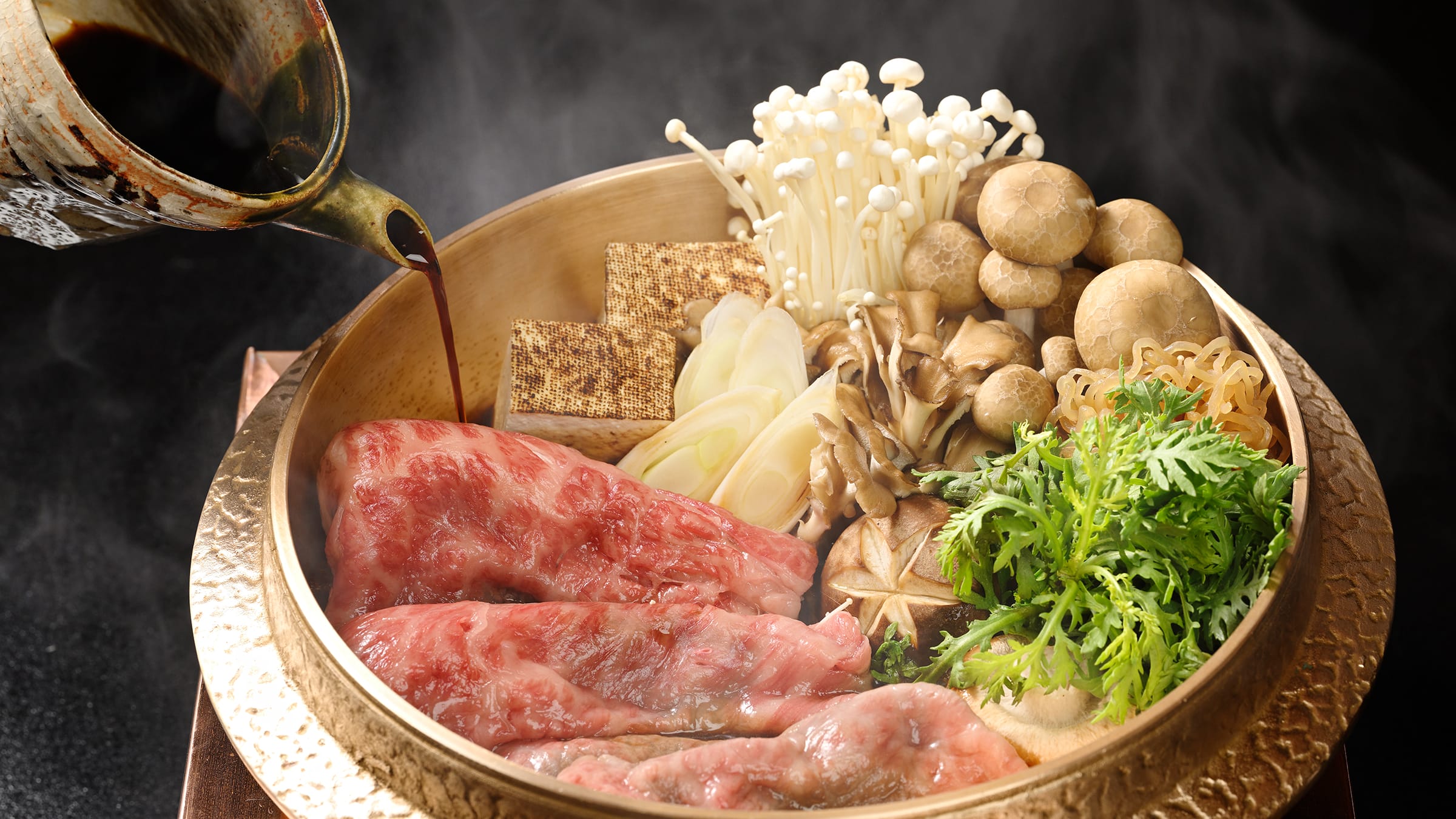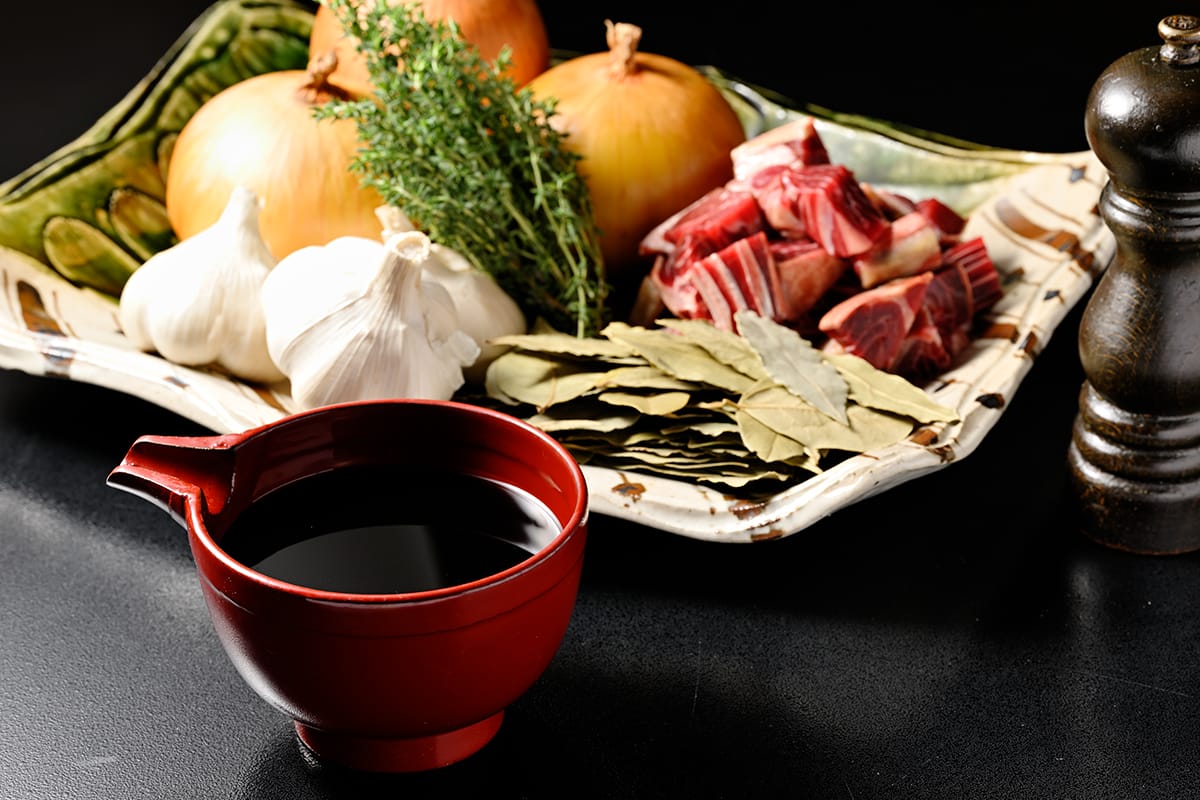 うかいの和食店の料理長を歴任した料理人が、うかい特選牛をすき焼きで存分に楽しんでいただくために研究を重ねたオリジナルの割り下。フランス料理のソース「ジュ・ド・ブッフ」の発想を取り入れて、牛の旨みを凝縮させました。白ワインとタイム、ローリエを隠し味に加え、香り豊かで深みのある味わいに仕上げています。