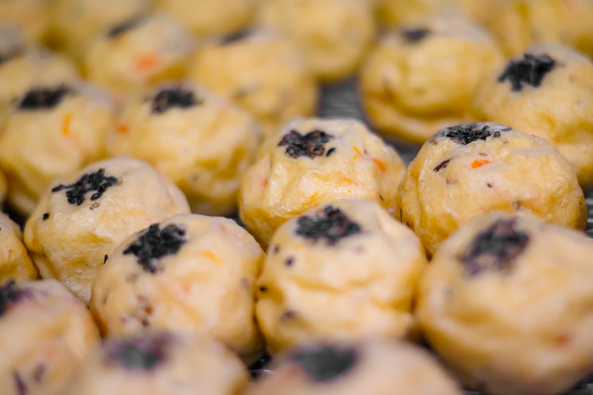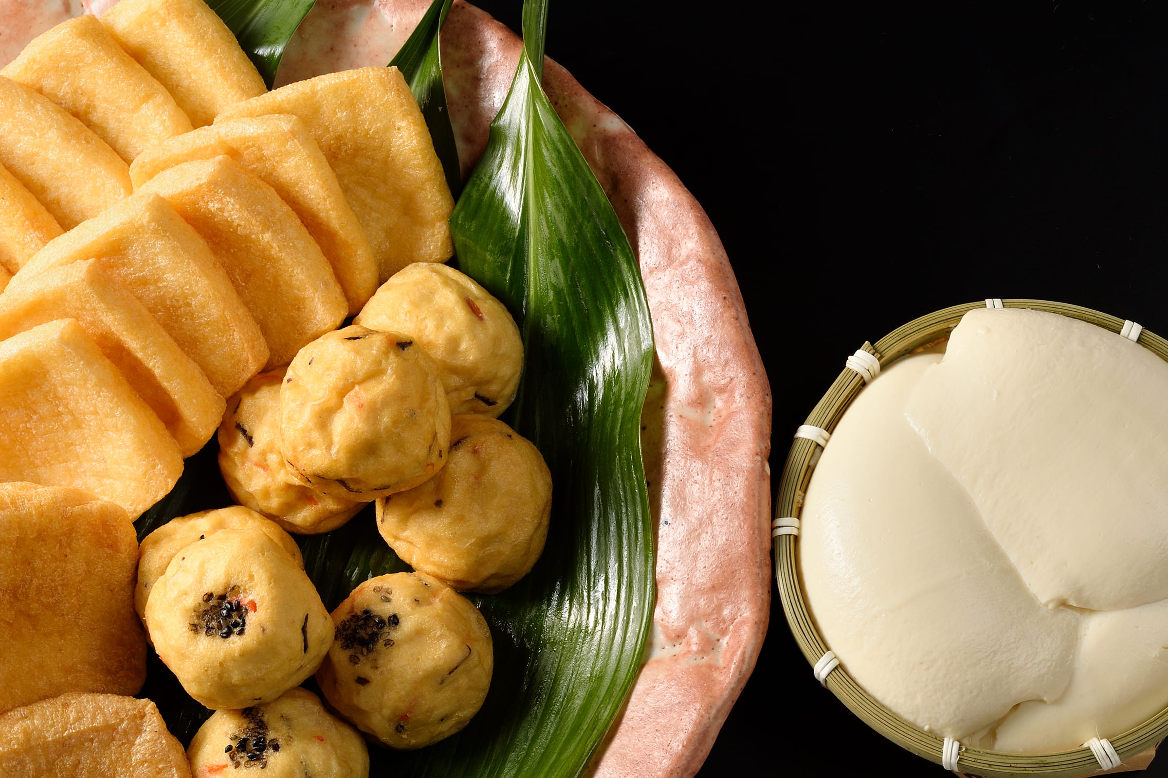 がんもどきは「くみあげとうふ」や「豆水とうふ」と同じ濃厚な生地に、山芋やきくらげ、人参などの具材をじっくり混ぜ込みます。一つひとつ職人の手でやさしく丸め、こんがりと手揚げすることで、温もりが伝わる美味しさに。むっちりとした食感と素材の豊かな風味が自慢の一品です。大豆の旨味が凝縮されているため、シンプルにそのままでも美味しくお召し上がりいただけます。
