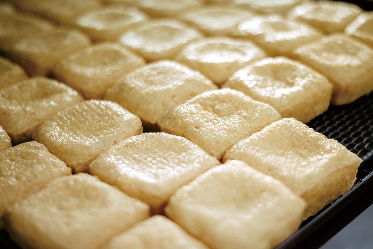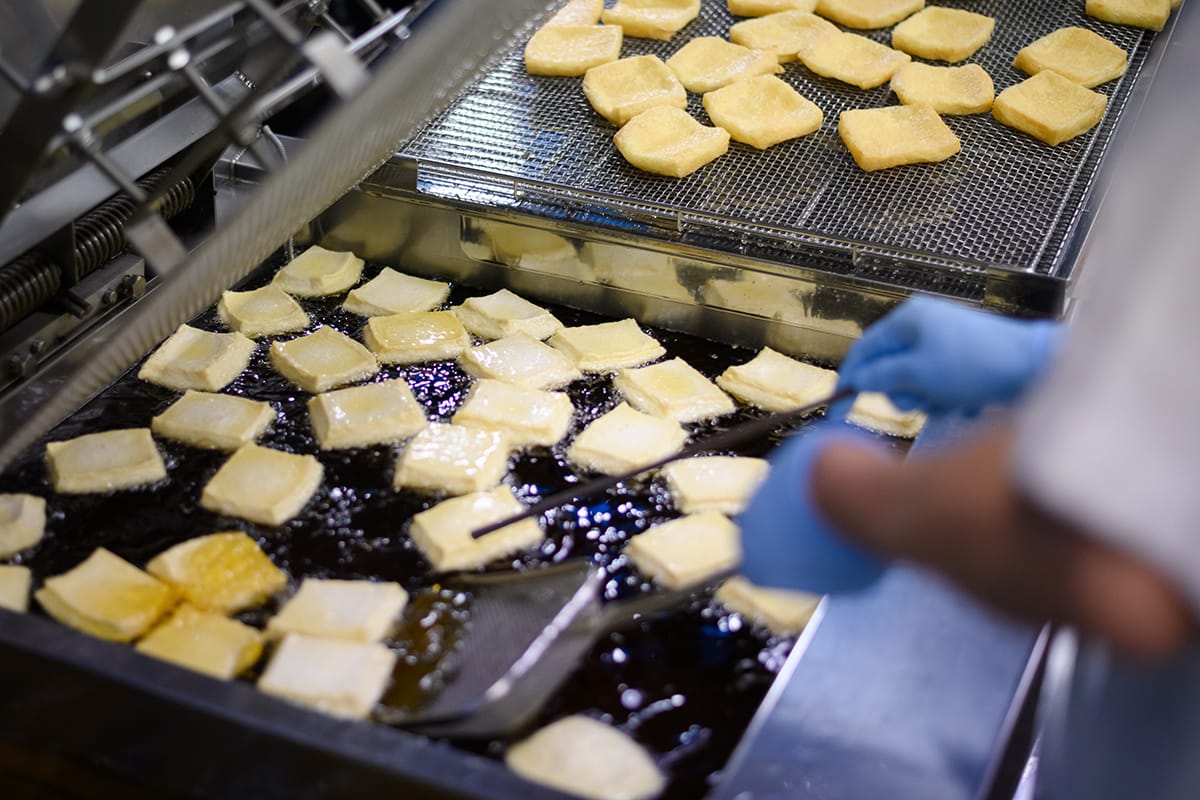とうふ屋うかいの油揚げには、一粒が大きくしっかりとした秋田県産大豆「りゅうほう」を使用。揚げるとふっくらと膨らみやすいのが特長です。前日から水分を抜いたとうふを低温と高温の油に順にくぐらせる「浮かし揚げ製法」によって、外は香ばしく、中はジューシーに。料理や用途に応じて工程の中で大きさや厚みを丁寧に調整しています。