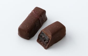 自家製ヴァンショーのパート・ド・フリュイに、ヴァンショージャムとチョコを合わせたマジパンを重ね、ダークチョコでコーティングしました。