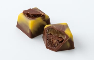 ミルクチョコの器に、バナナのパート・ド・フリュイ、バナナキャラメルショコラ、ピーカンナッツ入りチョコを閉じ込めました。