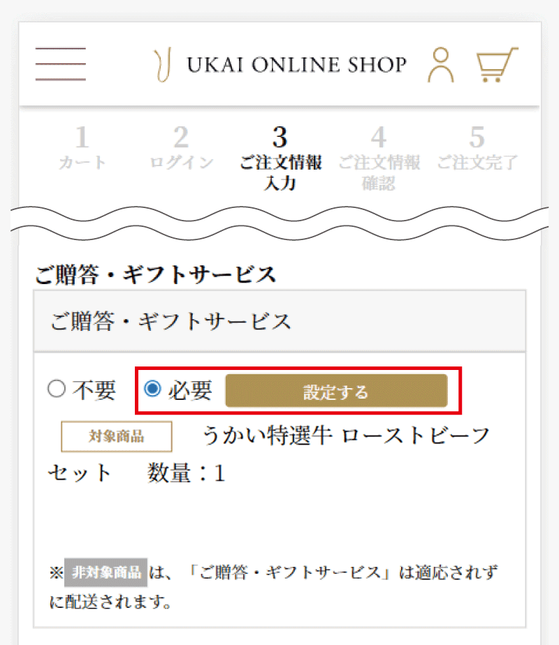 【ご注文情報入力画面】の3ページ目にある「ご贈答・ギフトサービス」にて、